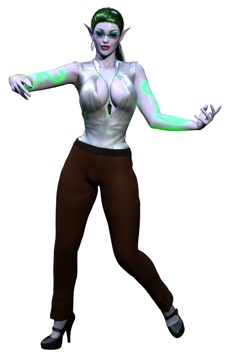 A tall elf, she has the long ears typical of high elves, but it’s her skin that shows she’s actually a moon elf, a species of more nocturnal high elves. It is a pale purple colour, and seems almost translucent. She also has glowing green tattoos in what looks to be a tribal pattern over her entire body, except her neck and head. These are actually magical sigils she uses in her job, which is why they always glow. They also cause her green eyes to glow. This glow is plainly visible in the dark, and slightly visible in broad daylight. Her long hair is a dark green, and she keeps it tied in a ponytail behind her back.