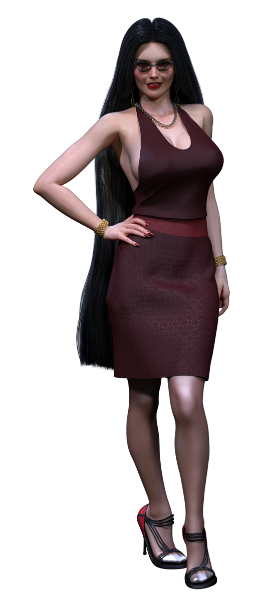 As she is usually in a costume for her job, or dressed up for some gala event, she doesn’t often get to dress the way she wants to. When she does get a choice, she tends towards an open back top, usually something low cut with no arms, and a medium length skirt. She does love high heels, even though it only adds to her impressive height. She has some favourite jewelry pieces she tends to wear as well, a necklace that looks like a heavy chain, bracelets that look like open link chain mail, and earrings that are a set of connected looks, like a chain.