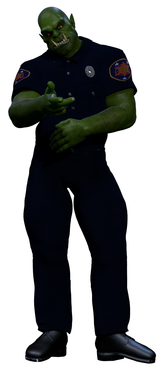 An imposing officer, even when he’s not in uniform, this man has a no-nonsense look to him that makes sure those who are doing wrong know that he’s not to be messed with. He’s made a name for himself in the force by not only smacking more heads than is strictly necessary, but also for getting the job done. So much so, that while he is a beat cop he’s partnered with Magical Crime Investigations Bureau to solve magical crime in the area. His partner with them is the talented [Krysta Jameson]. He also is kind of an outcast to many other orcs in the city because of his job, but he doesn’t care.