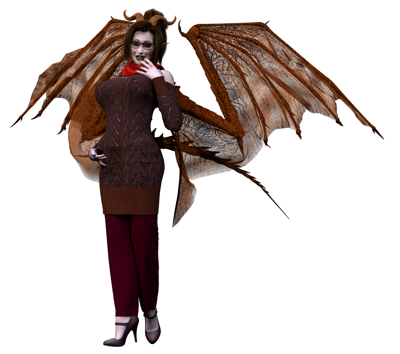 Average height for an elf, she tends to be very plain. With her usual style of clothing, she does hide very well the exceptional body that she has, including the large chest. She has mid length ears similar to some elves, so she plays herself off as one. She is actually a mid ranking succubus, with medium sized orange-brown wings and tail. She had light brown horns that start at the top of her head, and curl backwards and outwards. All of these are kept hidden at all times, but she is thinking of telling her fiance and showing him.