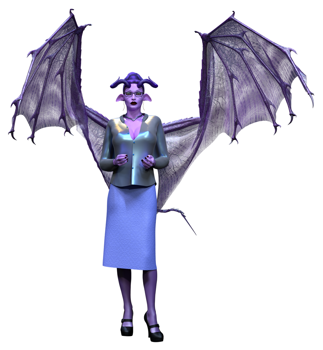 She tends to go with dark red lipstick and nails, as well as a light blue eye shadow. She has long horns that come from the front of her head, going outwards and sweeping back, almost the same colour as her hair, and they appear to have cracks in them, but this is just patterns. She has a medium sized set of wings and tail, both purple in colour, with their size denoting a mid rank succubus. She keeps them all visible at all times, only adding to her imposing appearance.
